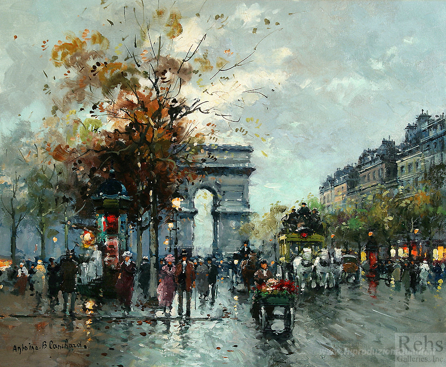 Ti offriamo una riproduzione artigianale su tela dell'opera famosa 'Champs Elysees, Arc de Triomphe' di Antoine Blanchard, dal Museo delle Riproduzioni.