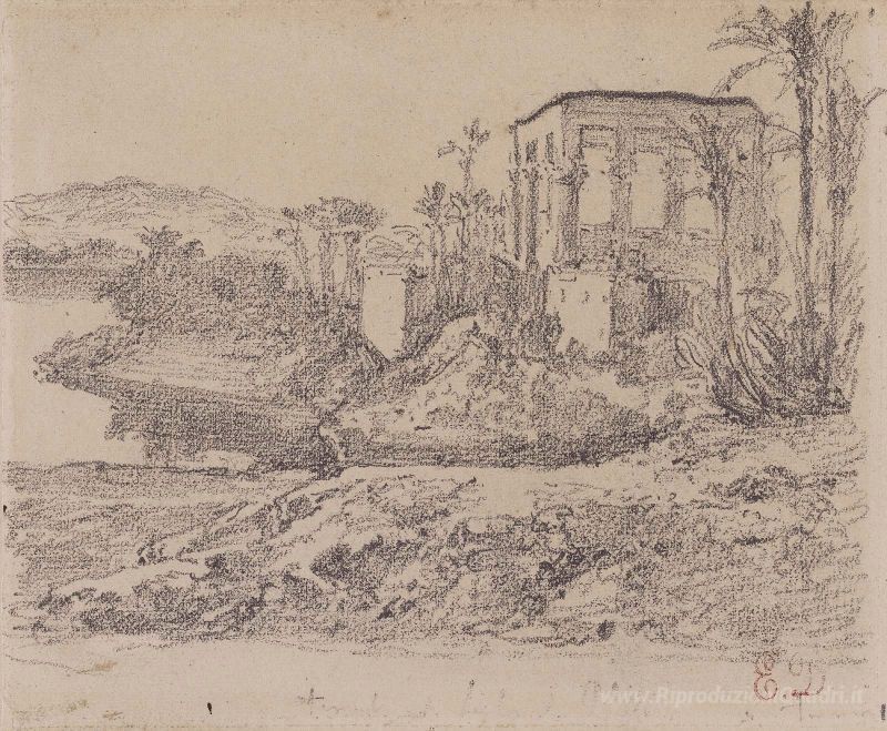 Ti offriamo una riproduzione artigianale su tela dell'opera famosa 'Chiosco di Traiano a Philae' di Eugene Delacroix, dal Museo delle Riproduzioni.