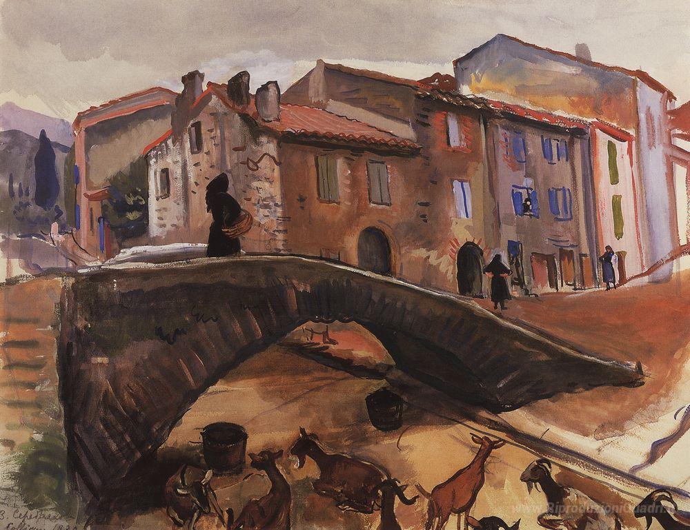 Ti offriamo una riproduzione artigianale su tela dell'opera famosa 'Collioure. Bridge con le capre' di Zinaida Serebriakova, dal Museo delle Riproduzioni.