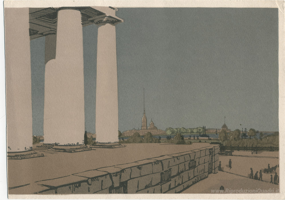 Ti offriamo una riproduzione artigianale su tela dell'opera famosa 'Colonnato di Exchange e Fortezza di Pietro e Paolo' di Anna Ostroumova-Lebedeva, dal Museo delle Riproduzioni.