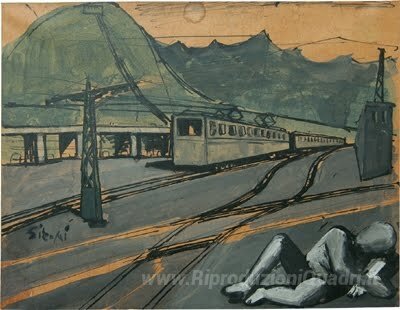 Ti offriamo una riproduzione artigianale su tela dell'opera famosa 'Composizione con il treno e la figura' di Mario Sironi, dal Museo delle Riproduzioni.