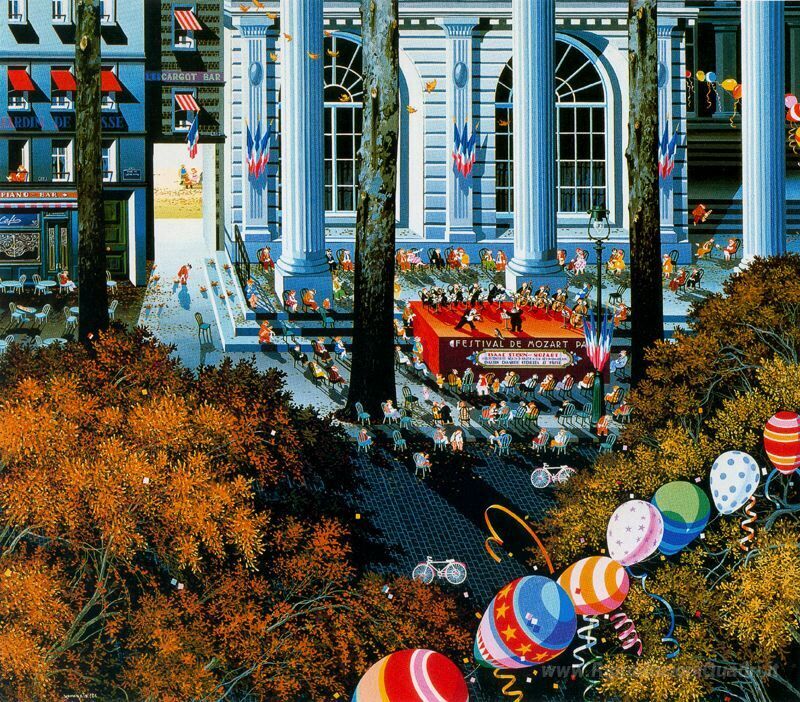 Ti offriamo una riproduzione artigianale su tela dell'opera famosa 'Concerto in the City' di Hiro Yamagata, dal Museo delle Riproduzioni.