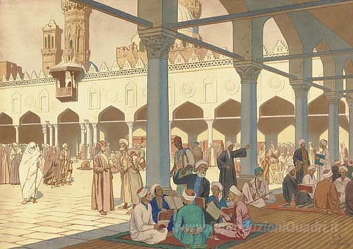 Ti offriamo una riproduzione artigianale su tela dell'opera famosa 'Cortile di Al-Azhar moschea e complesso universitario Cairo' di Ivan Bilibin, dal Museo delle Riproduzioni.