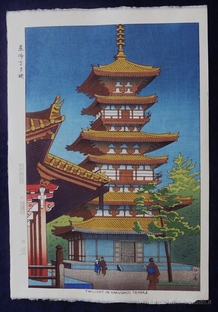 Ti offriamo una riproduzione artigianale su tela dell'opera famosa 'Crepuscolo al Tempio Yakushiji' di Asano Takeji, dal Museo delle Riproduzioni.