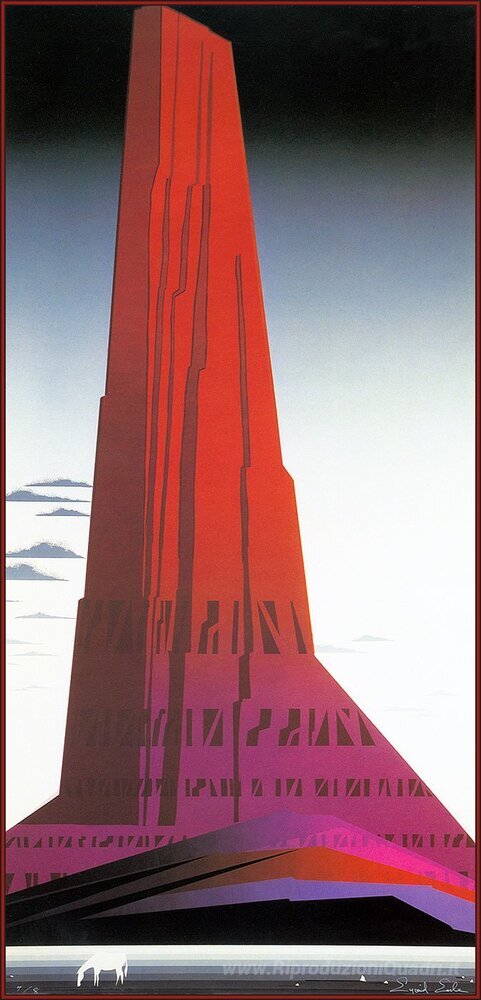 Ti offriamo una riproduzione artigianale su tela dell'opera famosa 'Desert Skyscraper' di Eyvind Earle, dal Museo delle Riproduzioni.