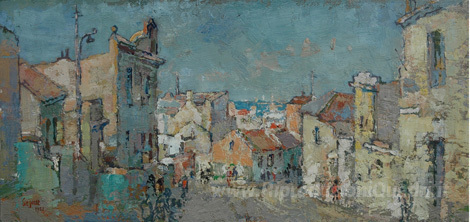 Ti offriamo una riproduzione artigianale su tela dell'opera famosa 'District Six con vista porto' di Gregoire Boonzaier, dal Museo delle Riproduzioni.