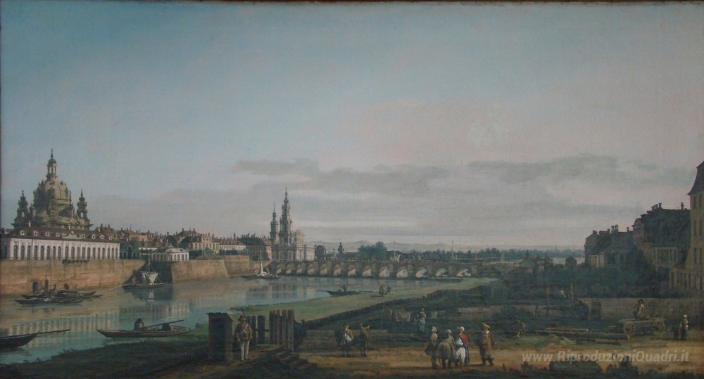 Ti offriamo una riproduzione artigianale su tela dell'opera famosa 'Dresda visto dalla riva destra del fiume Elba, sotto il Ponte di' di Bernardo Bellotto, dal Museo delle Riproduzioni.