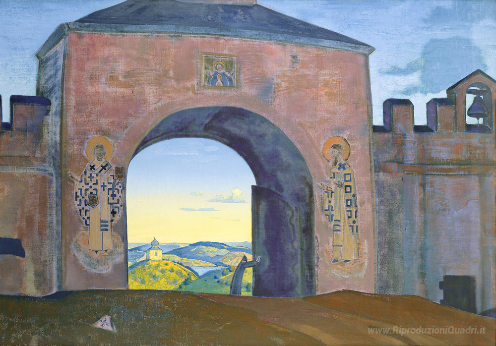 Ti offriamo una riproduzione artigianale su tela dell'opera famosa 'E stiamo aprendo le porte' di Nicholas Roerich, dal Museo delle Riproduzioni.