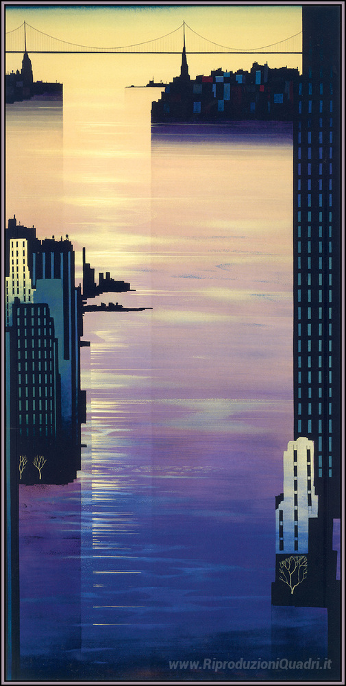 Ti offriamo una riproduzione artigianale su tela dell'opera famosa 'East River' di Eyvind Earle, dal Museo delle Riproduzioni.