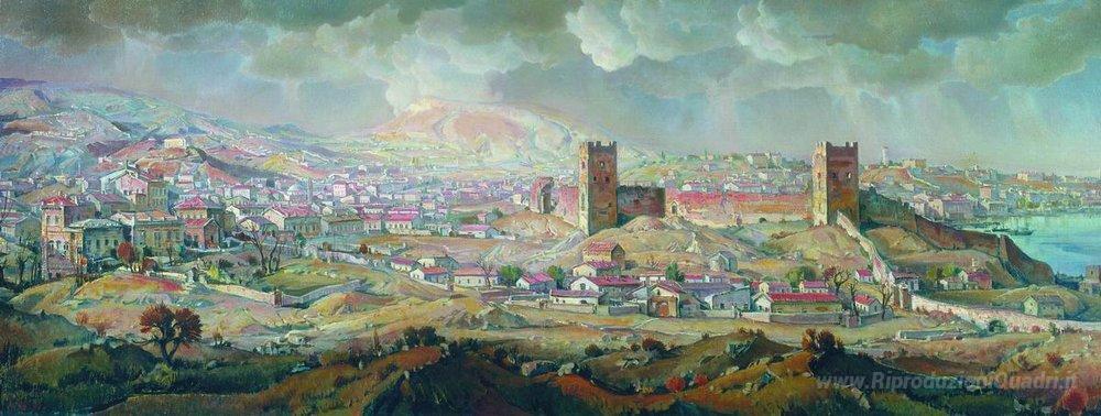 Ti offriamo una riproduzione artigianale su tela dell'opera famosa 'Feodosia' di Konstantin Bogaevsky, dal Museo delle Riproduzioni.