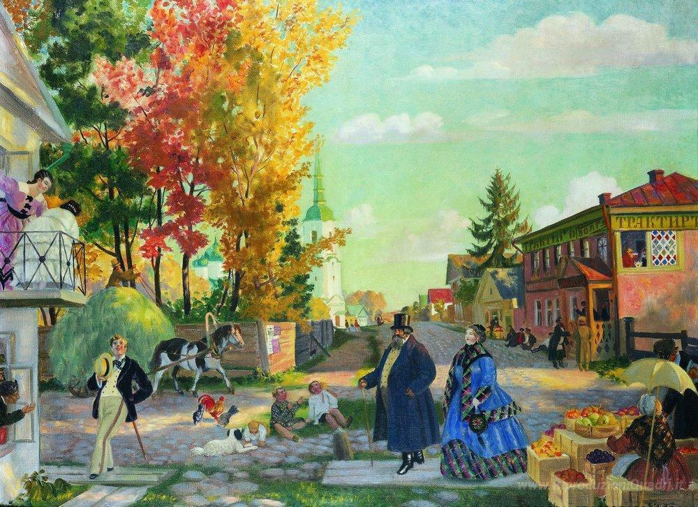 Ti offriamo una riproduzione artigianale su tela dell'opera famosa 'Feste autunnali' di Boris Kustodiev, dal Museo delle Riproduzioni.