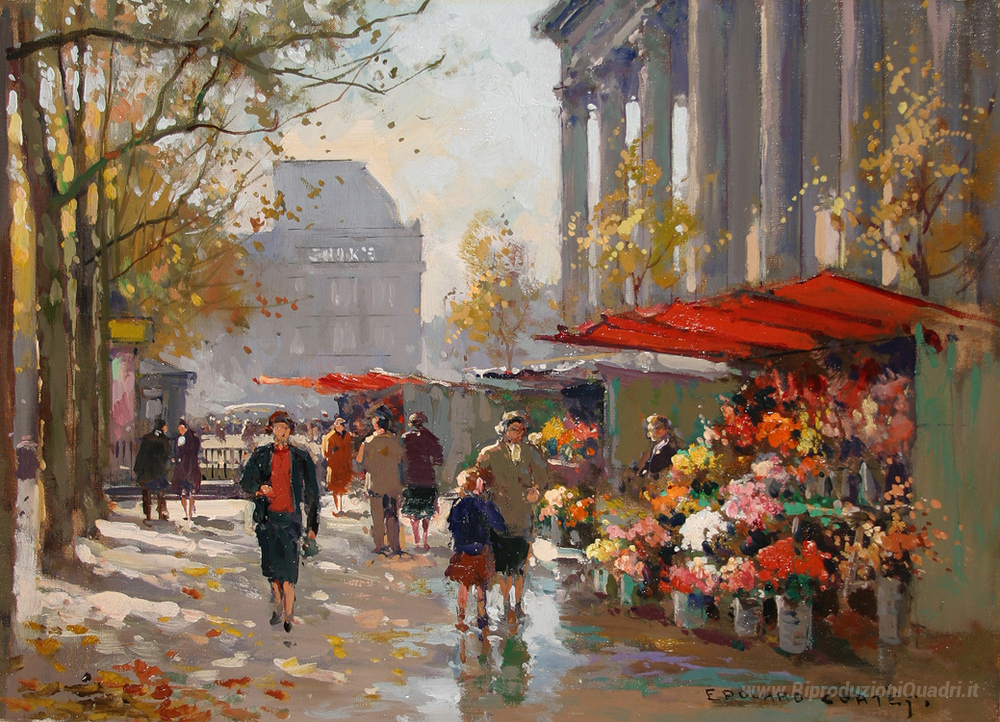 Ti offriamo una riproduzione artigianale su tela dell'opera famosa 'Flower Seller a La Madeleine' di Edouard Cortes, dal Museo delle Riproduzioni.