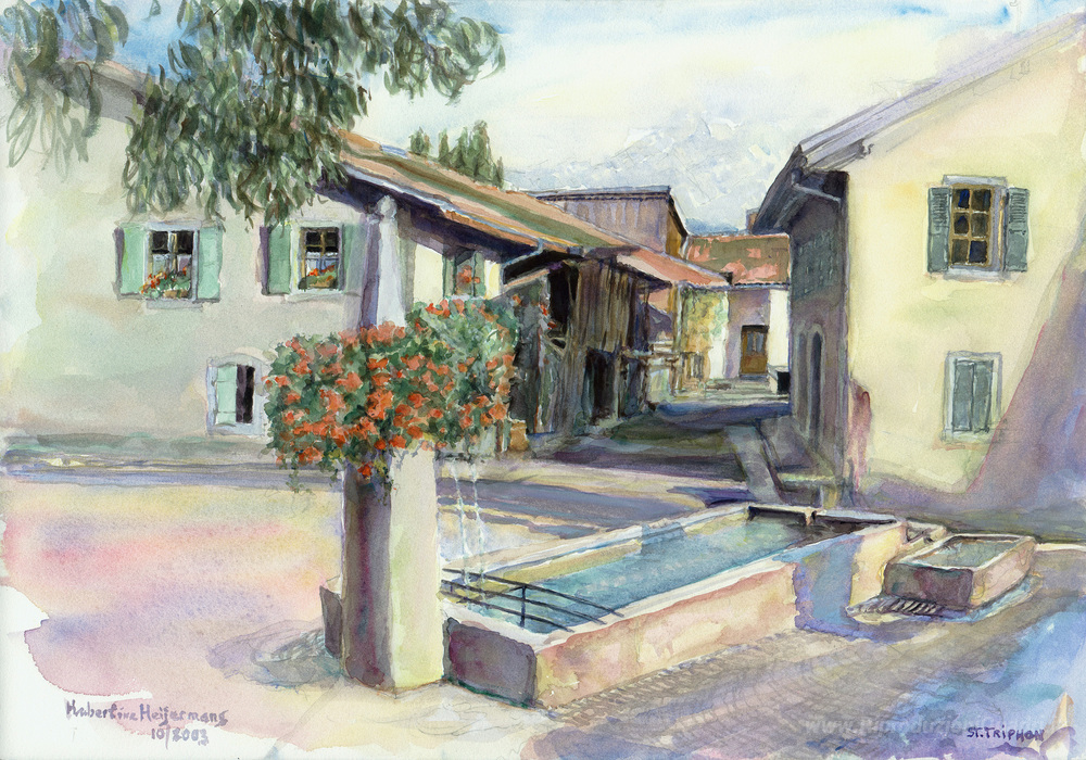 Ti offriamo una riproduzione artigianale su tela dell'opera famosa 'Fontana nel villaggio di Saint-Triphon, cantone di Vaud, Svizzer' di Hubertine Heijermans, dal Museo delle Riproduzioni.