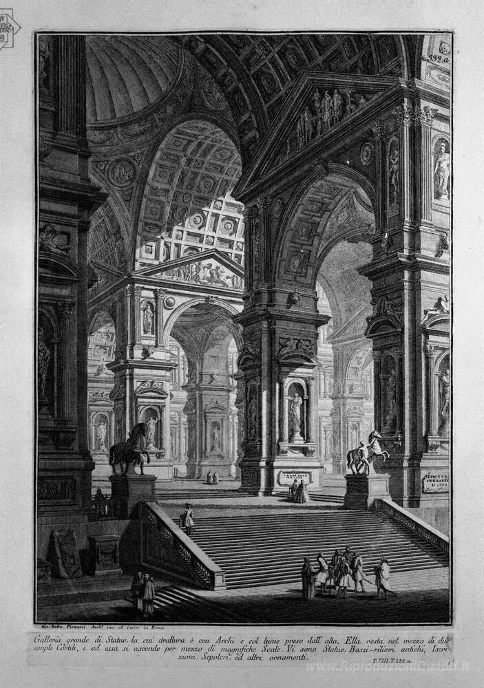 Ti offriamo una riproduzione artigianale su tela dell'opera famosa 'Grande galleria di statue in mezzo a due ampi cortili (il titolo' di Giovanni Battista Piranesi, dal Museo delle Riproduzioni.