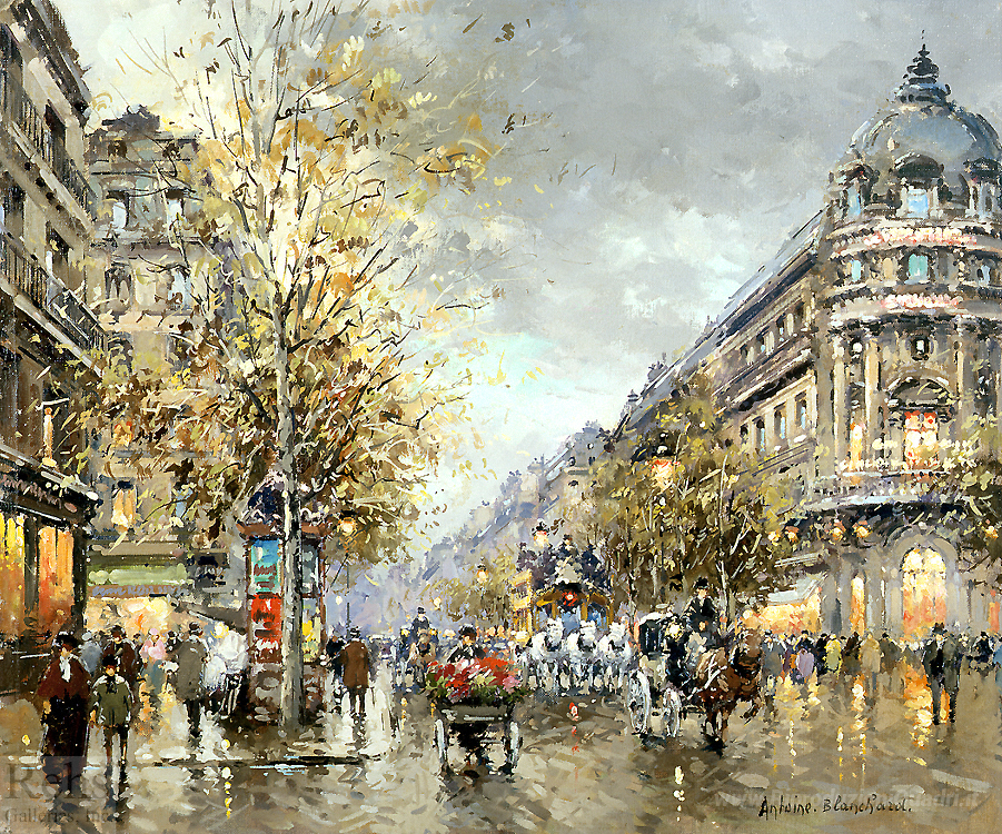 Ti offriamo una riproduzione artigianale su tela dell'opera famosa 'Grands Boulevards' di Antoine Blanchard, dal Museo delle Riproduzioni.
