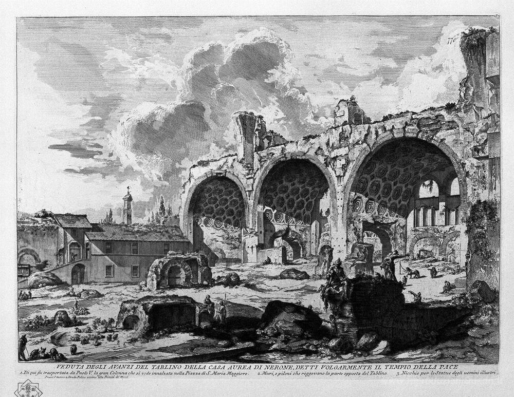 Ti offriamo una riproduzione artigianale su tela dell'opera famosa 'Guarda i resti di Nero`s Golden House Tablino, volgarmente chiam' di Giovanni Battista Piranesi, dal Museo delle Riproduzioni.
