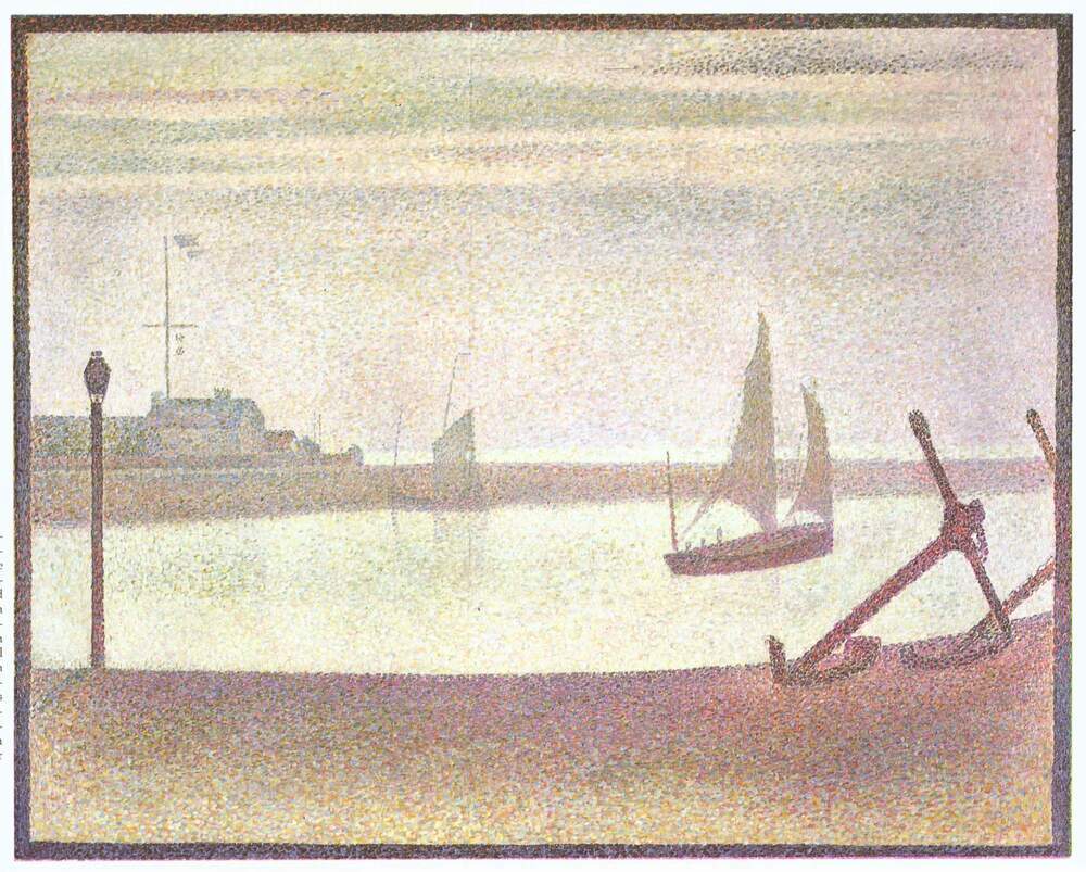 Ti offriamo una riproduzione artigianale su tela dell'opera famosa 'Il canale di Gravelines, sera' di Georges Seurat, dal Museo delle Riproduzioni.
