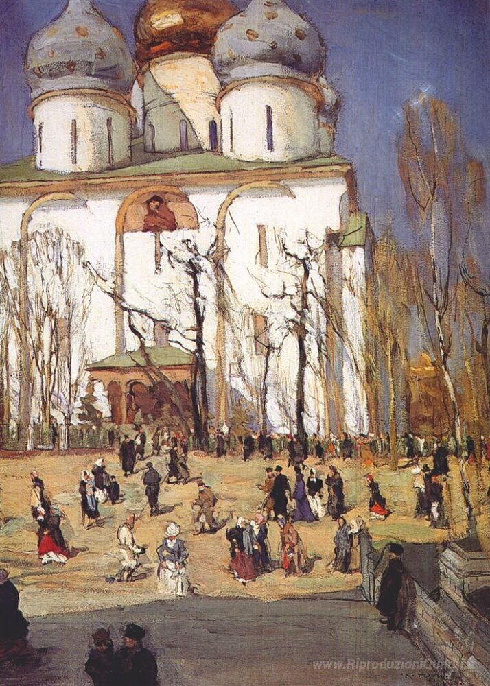 Ti offriamo una riproduzione artigianale su tela dell'opera famosa 'Il Day Celebration' di Konstantin Yuon, dal Museo delle Riproduzioni.