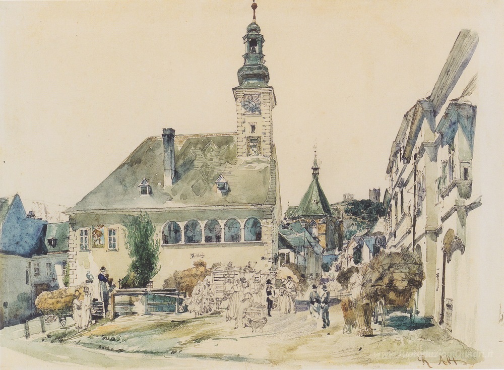 Ti offriamo una riproduzione artigianale su tela dell'opera famosa 'Il Municipio a M?dling' di Rudolf von Alt, dal Museo delle Riproduzioni.