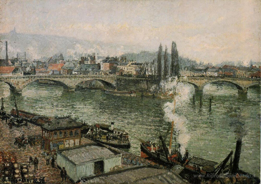 Ti offriamo una riproduzione artigianale su tela dell'opera famosa 'Il Pont Corneille, Rouen, Grigio Meteo' di Camille Pissarro, dal Museo delle Riproduzioni.