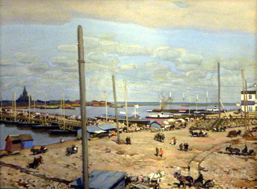 Ti offriamo una riproduzione artigianale su tela dell'opera famosa 'Il ponte attraverso il fiume Oka a Nizhny Novgorod' di Konstantin Yuon, dal Museo delle Riproduzioni.