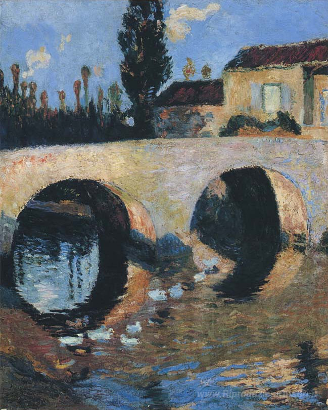Ti offriamo una riproduzione artigianale su tela dell'opera famosa 'Il ponte sul fiume' di Henri Martin, dal Museo delle Riproduzioni.