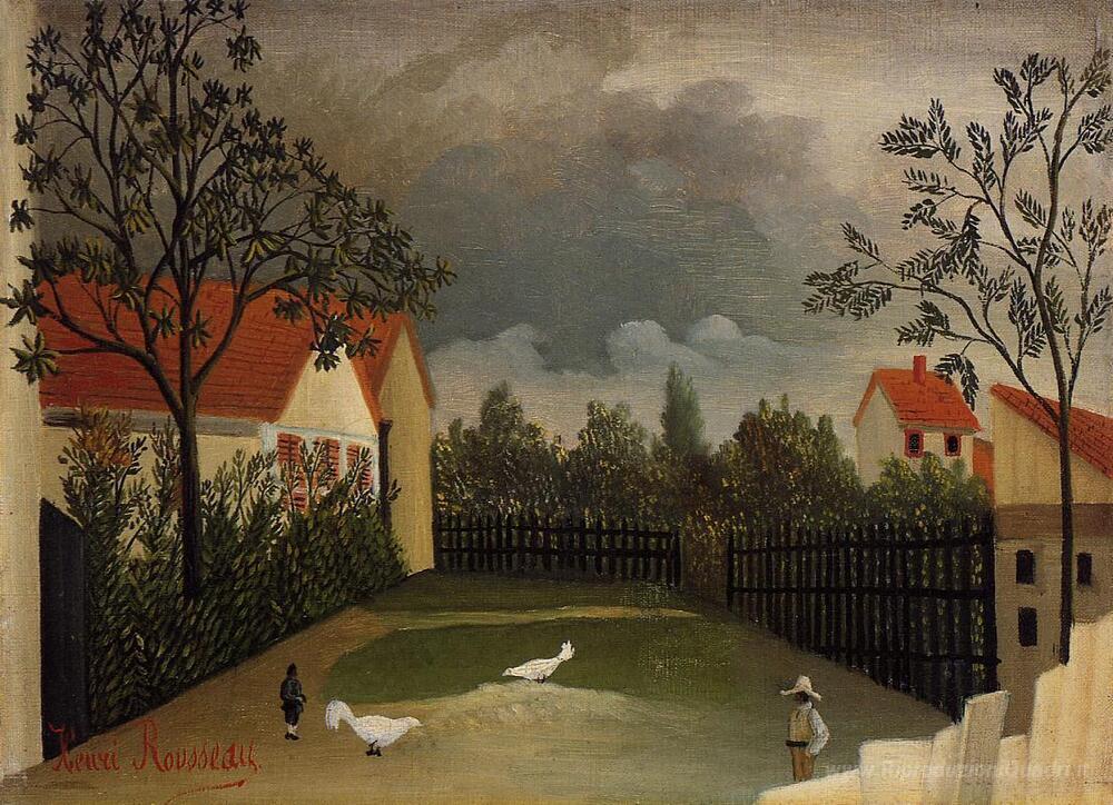 Ti offriamo una riproduzione artigianale su tela dell'opera famosa 'Il Poultry Yard' di Henri Rousseau, dal Museo delle Riproduzioni.