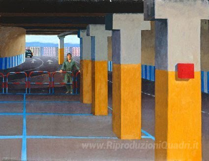 Ti offriamo una riproduzione artigianale su tela dell'opera famosa 'Il Supermercato Car Park II' di Jeffrey Smart, dal Museo delle Riproduzioni.