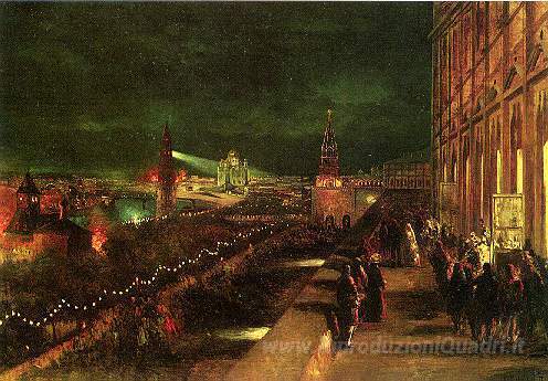 Ti offriamo una riproduzione artigianale su tela dell'opera famosa 'Illuminazione di Mosca, in occasione dell'incoronazione nel 1883' di Konstantin Makovsky, dal Museo delle Riproduzioni.