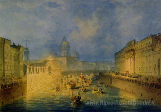 Ti offriamo una riproduzione artigianale su tela dell'opera famosa 'Illuminazione sul Moika Embankment di San Pietroburgo' di Vasily Sadovnikov, dal Museo delle Riproduzioni.