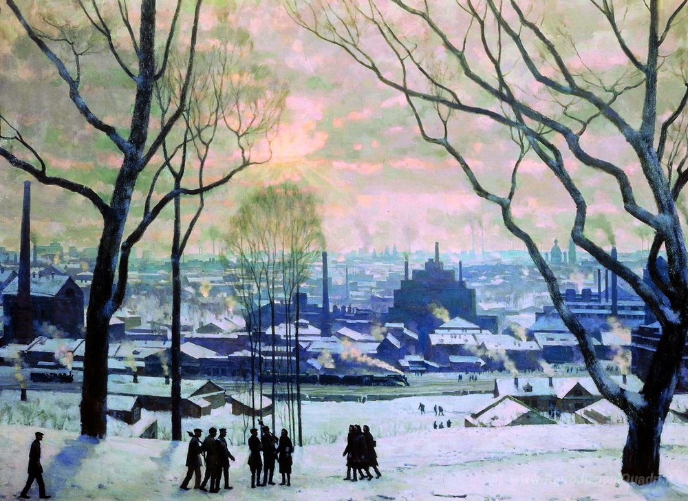 Ti offriamo una riproduzione artigianale su tela dell'opera famosa 'Industrial Mosca' di Konstantin Yuon, dal Museo delle Riproduzioni.
