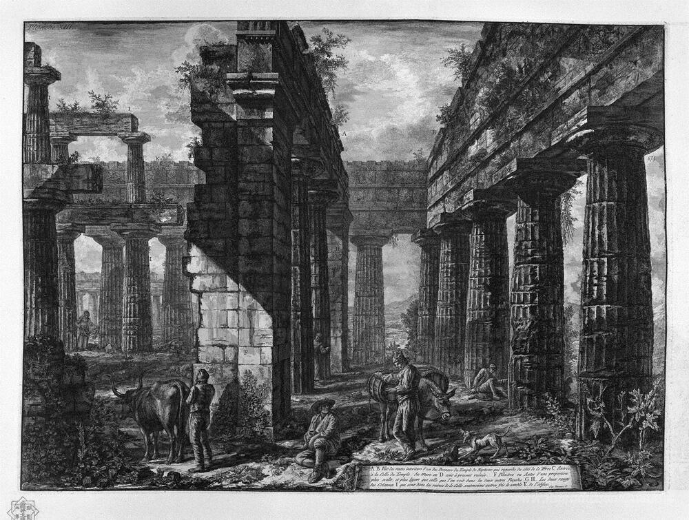 Ti offriamo una riproduzione artigianale su tela dell'opera famosa 'Interno del pronao del tempio stesso, che guarda verso il suolo' di Giovanni Battista Piranesi, dal Museo delle Riproduzioni.