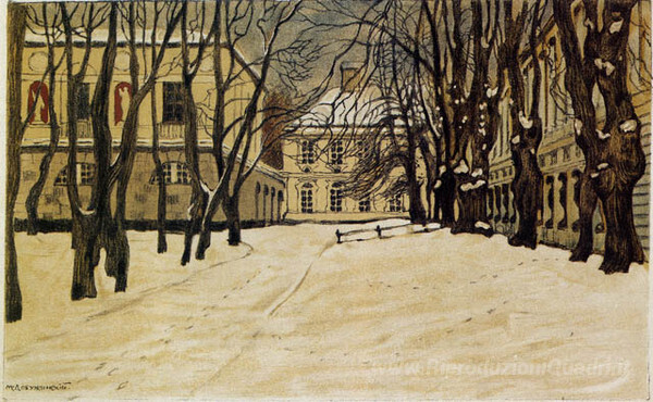 Ti offriamo una riproduzione artigianale su tela dell'opera famosa 'Inverno in Tsarskoye Selo' di Mstislav Dobuzhinsky, dal Museo delle Riproduzioni.