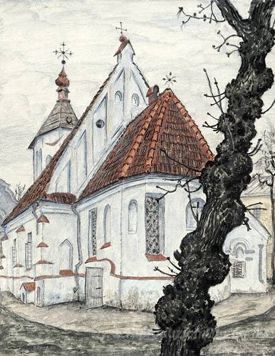 Ti offriamo una riproduzione artigianale su tela dell'opera famosa 'Kaunas. Chiesa Saric.' di Mstislav Dobuzhinsky, dal Museo delle Riproduzioni.