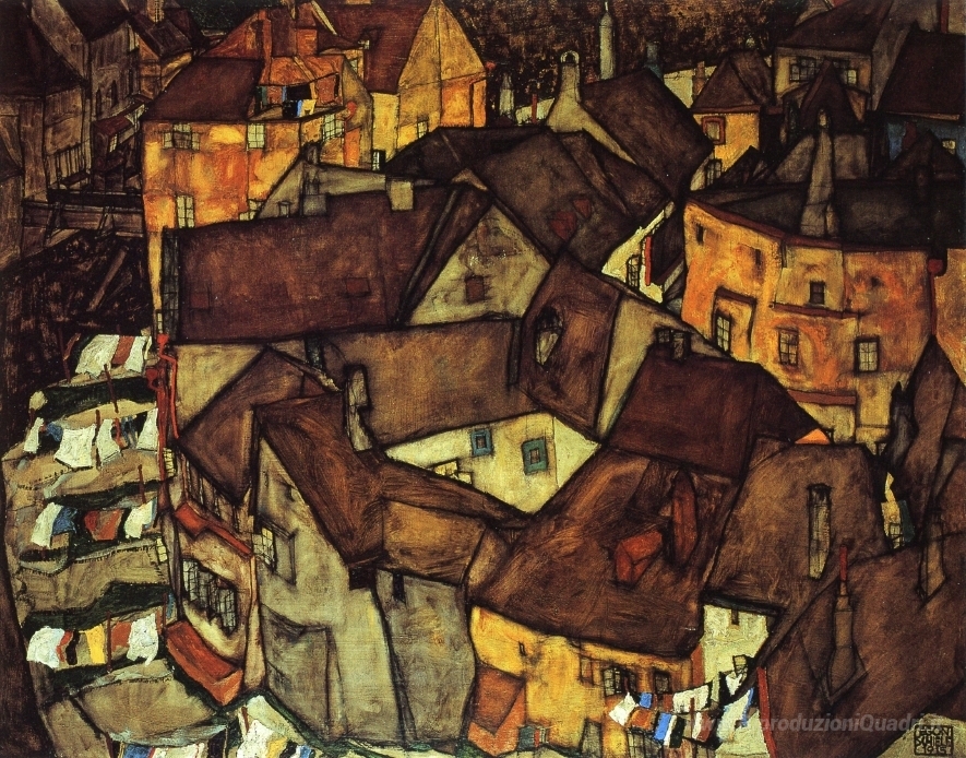 Ti offriamo una riproduzione artigianale su tela dell'opera famosa 'Krumau Città Crescent I' di Egon Schiele, dal Museo delle Riproduzioni.