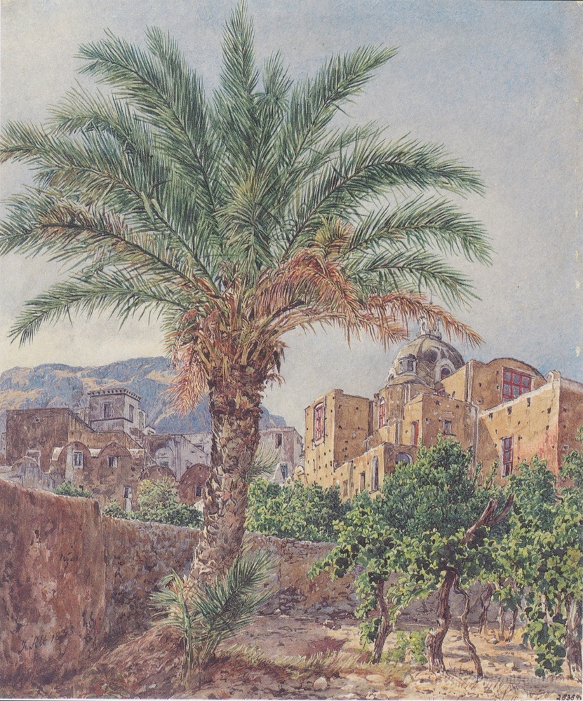 Ti offriamo una riproduzione artigianale su tela dell'opera famosa 'La Cattedrale di Capri' di Rudolf von Alt, dal Museo delle Riproduzioni.