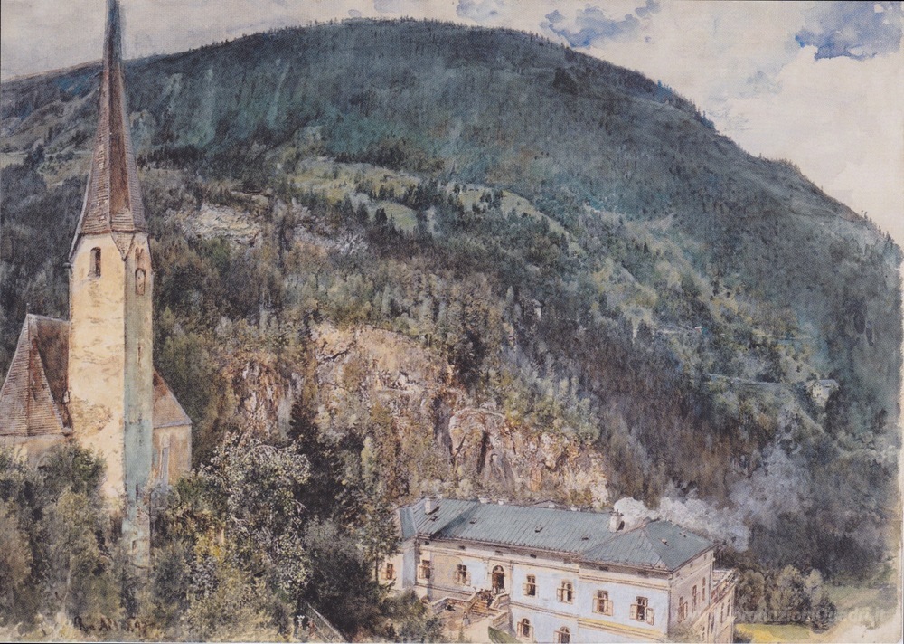 Ti offriamo una riproduzione artigianale su tela dell'opera famosa 'La Chiesa di San Nicola a Gastein' di Rudolf von Alt, dal Museo delle Riproduzioni.