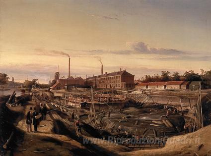 Ti offriamo una riproduzione artigianale su tela dell'opera famosa 'La costruzione di due gasometri per la Hollandsche Gazfabriek su' di Cornelis Springer, dal Museo delle Riproduzioni.