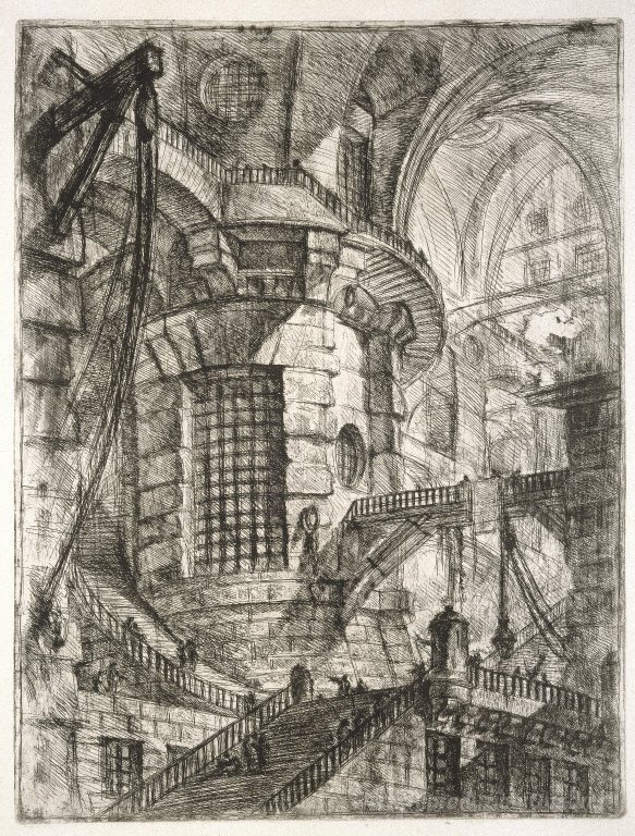 Ti offriamo una riproduzione artigianale su tela dell'opera famosa 'La Torre Rotonda, piatto III da `Carceri d`Invenzione`' di Giovanni Battista Piranesi, dal Museo delle Riproduzioni.