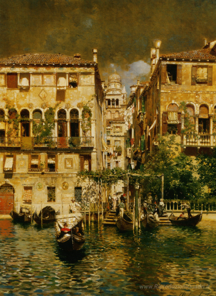 Ti offriamo una riproduzione artigianale su tela dell'opera famosa 'Lasciando una residenza sul Canal Grande' di Rubens Santoro, dal Museo delle Riproduzioni.