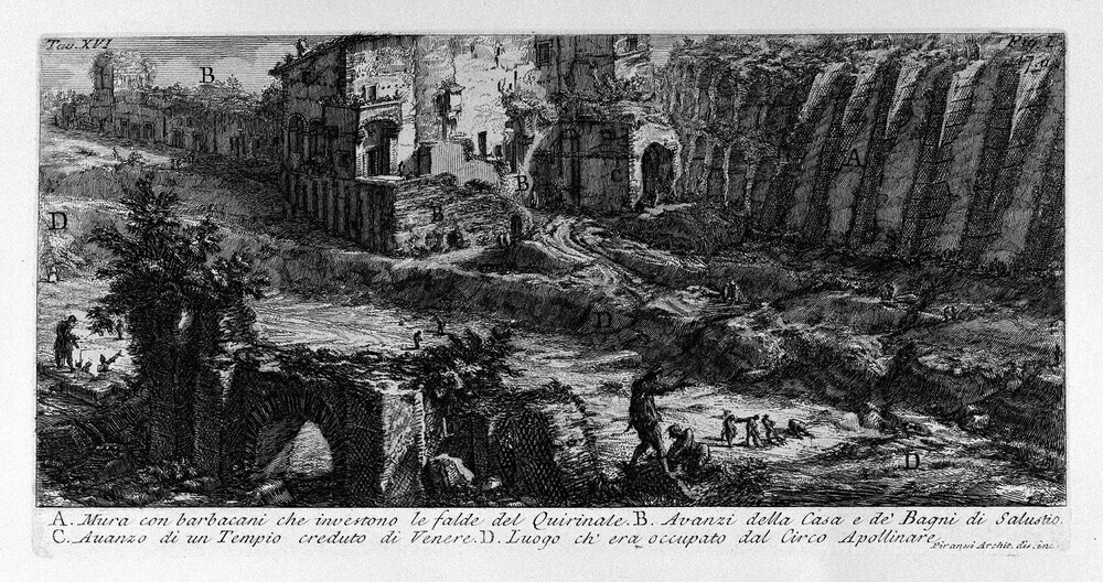 Ti offriamo una riproduzione artigianale su tela dell'opera famosa 'Le antichità romane, t. 1, Piatto XVI' di Giovanni Battista Piranesi, dal Museo delle Riproduzioni.