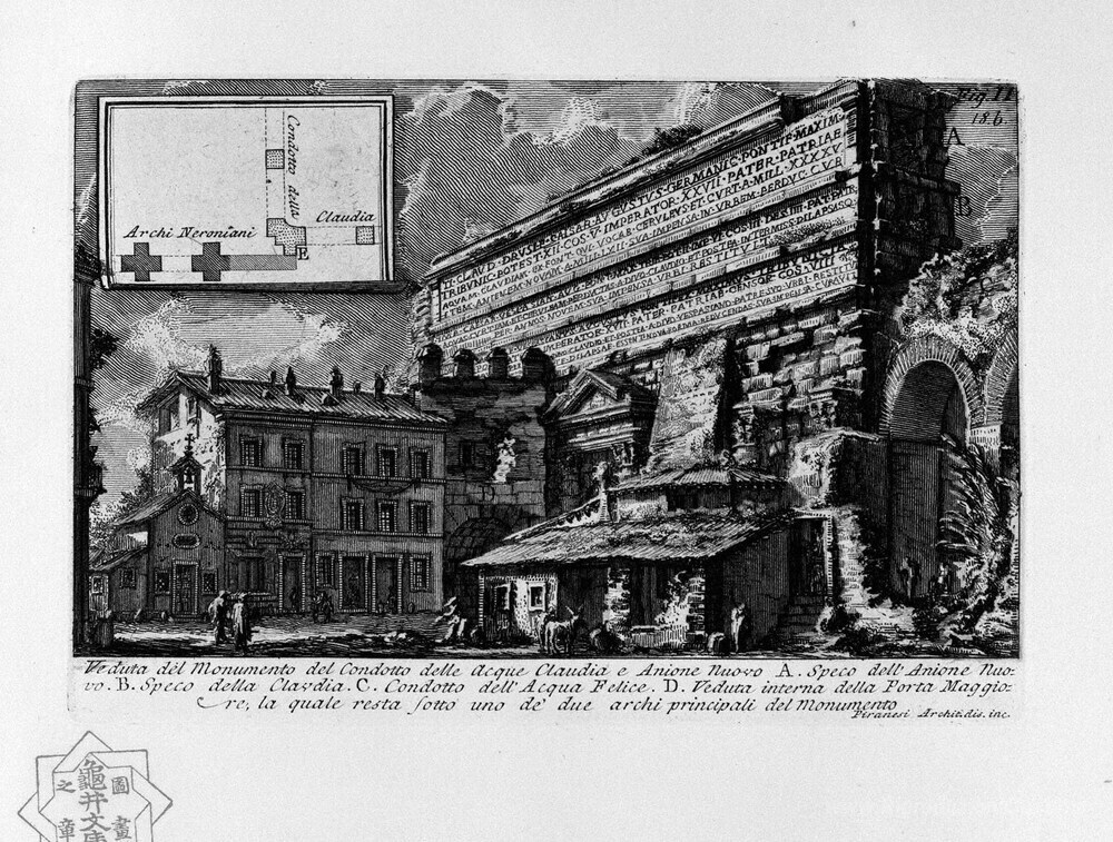 Ti offriamo una riproduzione artigianale su tela dell'opera famosa 'Le antichità romane, t. 1, Piatto XVII. Claudia.' di Giovanni Battista Piranesi, dal Museo delle Riproduzioni.