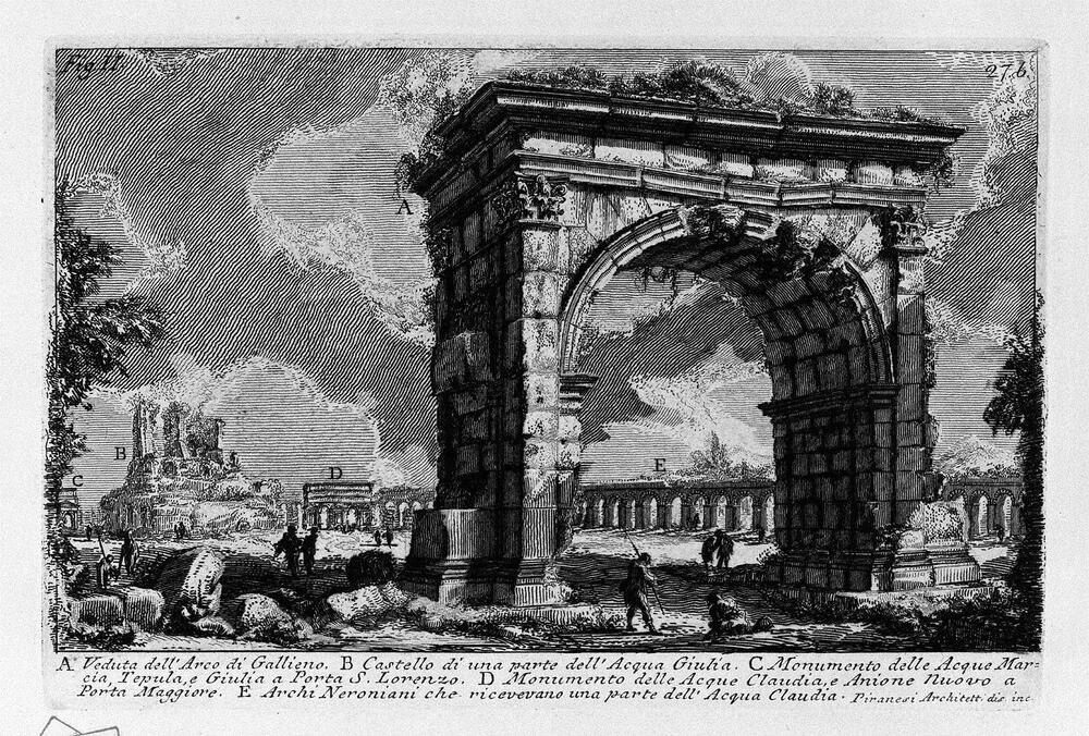 Ti offriamo una riproduzione artigianale su tela dell'opera famosa 'Le antichità romane, t. 1, Piatto XXVI. Arco di Gallieno.' di Giovanni Battista Piranesi, dal Museo delle Riproduzioni.