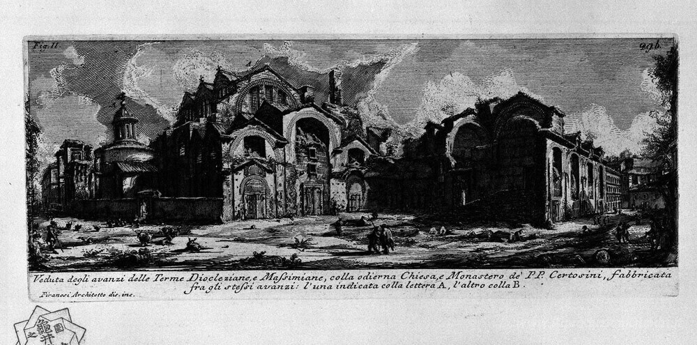 Ti offriamo una riproduzione artigianale su tela dell'opera famosa 'Le antichità romane, t. 1, Piatto XXVIII. Terme di Diocleziano.' di Giovanni Battista Piranesi, dal Museo delle Riproduzioni.