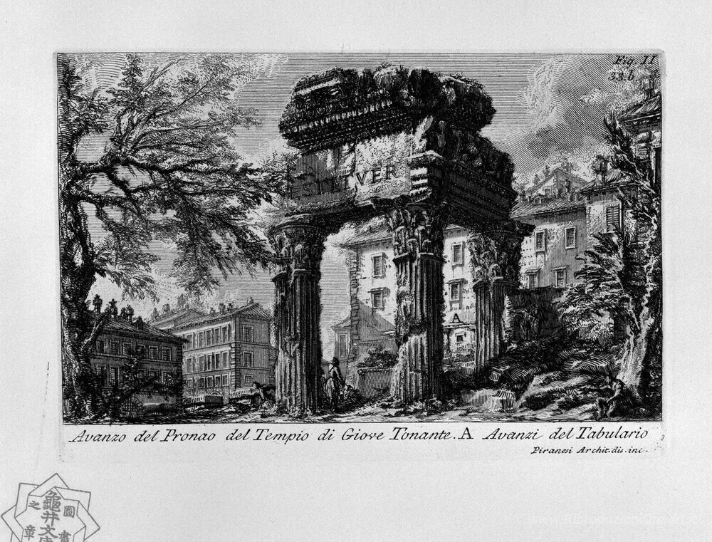 Ti offriamo una riproduzione artigianale su tela dell'opera famosa 'Le antichità romane, t. 1, Piatto XXXII. Le rovine del pronao de' di Giovanni Battista Piranesi, dal Museo delle Riproduzioni.