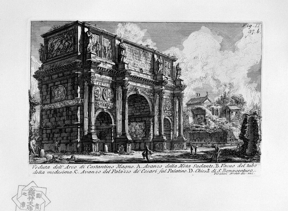 Ti offriamo una riproduzione artigianale su tela dell'opera famosa 'Le antichità romane, t. 1, Piatto XXXVI' di Giovanni Battista Piranesi, dal Museo delle Riproduzioni.
