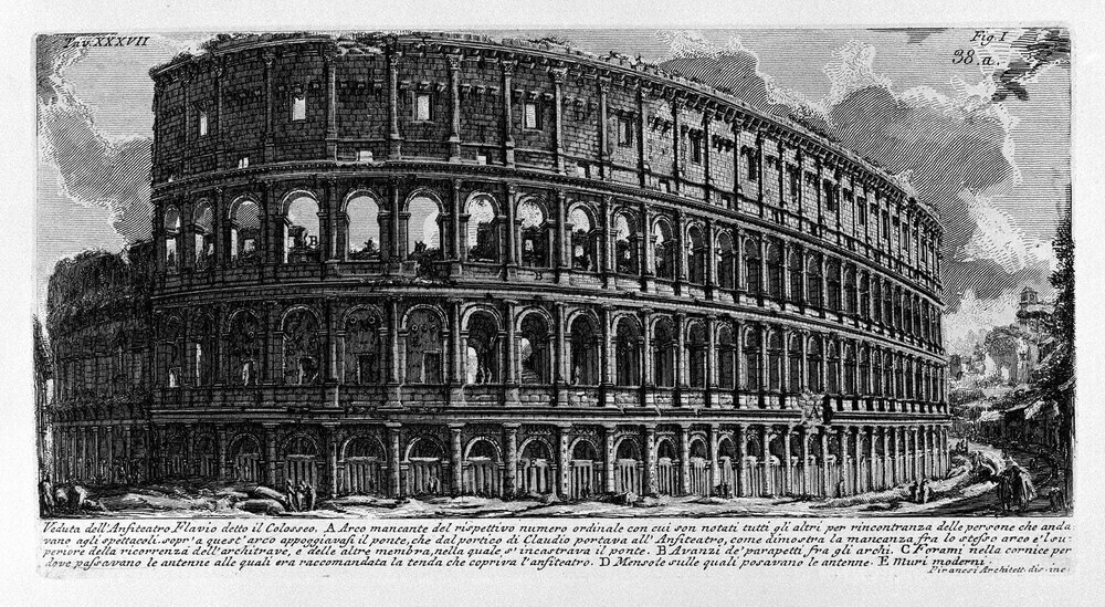 Ti offriamo una riproduzione artigianale su tela dell'opera famosa 'Le antichità romane, t. 1, Piatto XXXVII. Vista di Anfiteatro Fl' di Giovanni Battista Piranesi, dal Museo delle Riproduzioni.