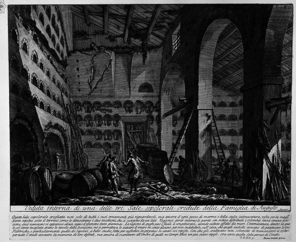 Ti offriamo una riproduzione artigianale su tela dell'opera famosa 'Le antichità romane, t. 2, Piatto XLII. Vista interna di una del' di Giovanni Battista Piranesi, dal Museo delle Riproduzioni.