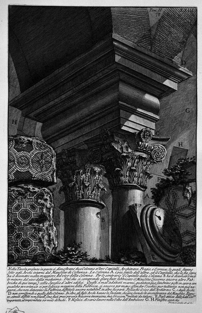 Ti offriamo una riproduzione artigianale su tela dell'opera famosa 'Le antichità romane, t. 2, Piatto XXIII. Resti del grande sepolt' di Giovanni Battista Piranesi, dal Museo delle Riproduzioni.