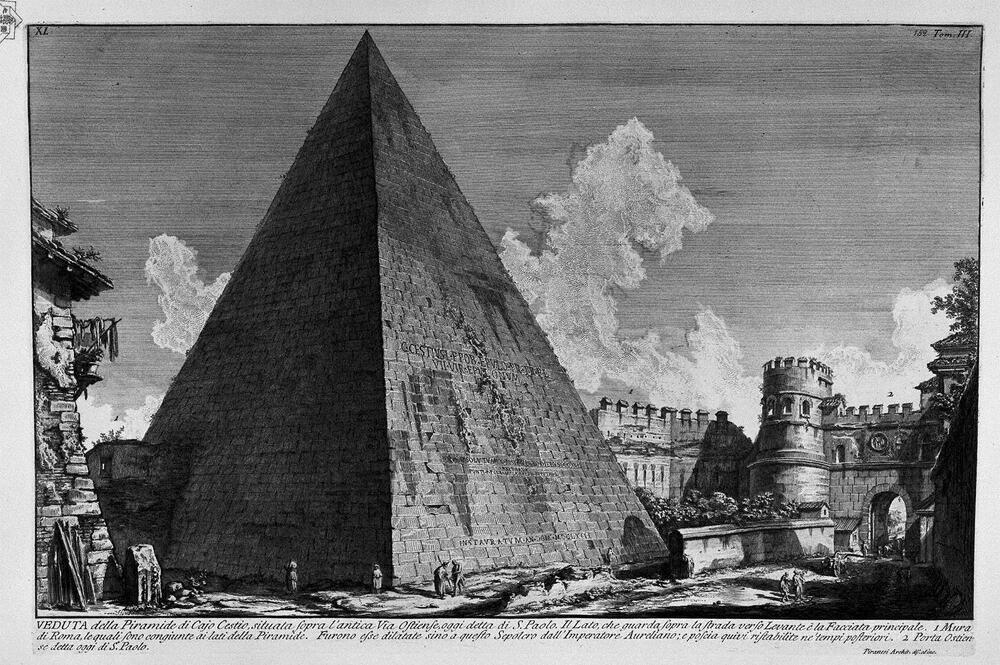 Ti offriamo una riproduzione artigianale su tela dell'opera famosa 'Le antichità romane, t. 3, Piatto XL. Veduta della Piramide di C' di Giovanni Battista Piranesi, dal Museo delle Riproduzioni.
